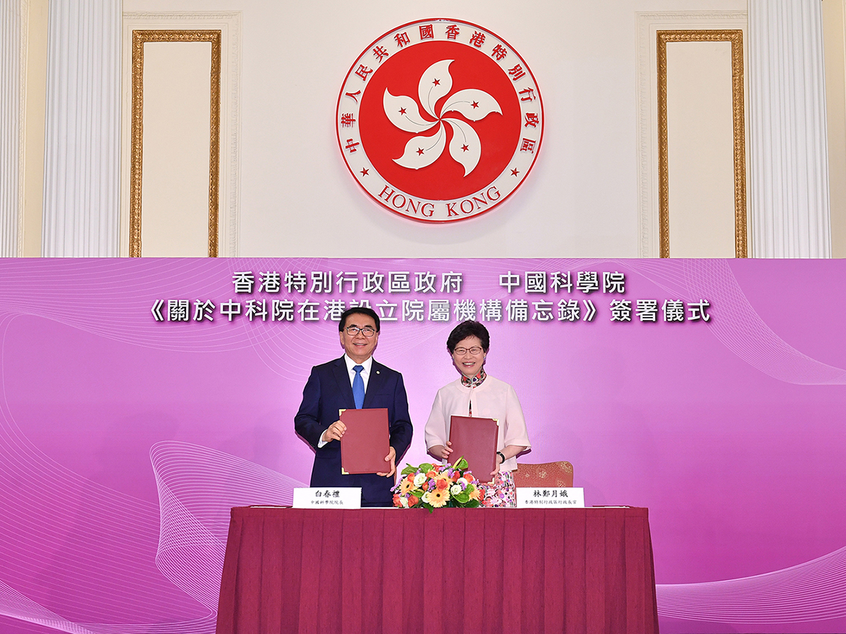 中国科学院与香港特区政府于2018年11月8日在港签署《关于中国科学院在香港设立院属机构的备忘录》,推动中科院在港的研发工作。中科院院长白春礼及香港特区行政长官林郑月娥出席签署仪式。